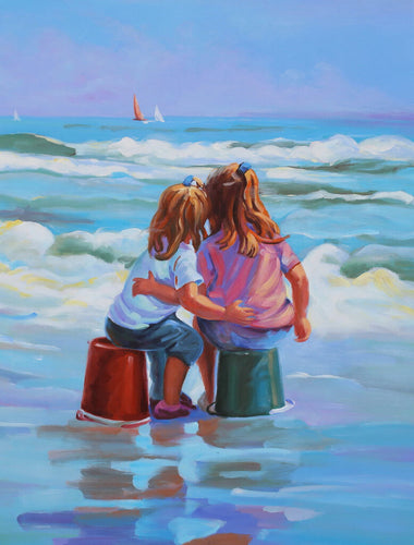 NEW Oil Painting - Two Girls Hugging on the Beach - cb-2024