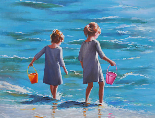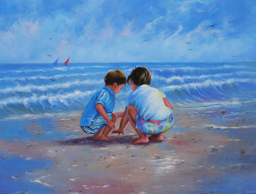 NEW Oil Painting - Two Kids at the Beach - cb-2027