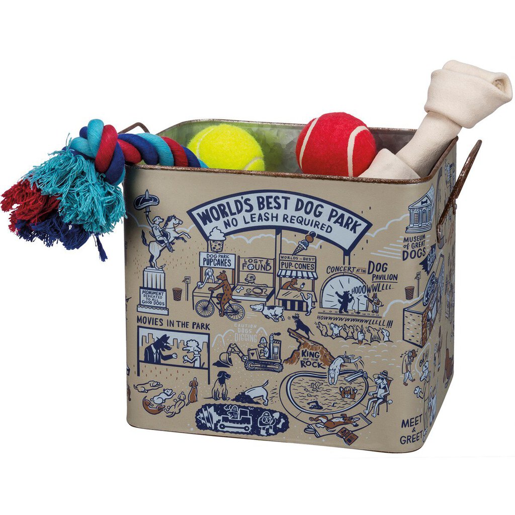 A square metal bucket featuring wrap-around dog-themed designs and clever sentiments. Contains top handles for easy carrying. 9.25" x 8.25" x 7.75"