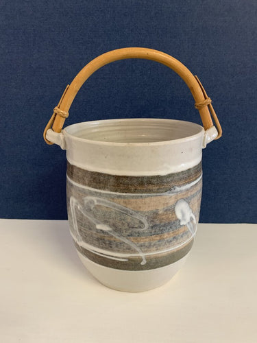 Hand Thrown Signed Ceramic Pot w/ Bamboo Handle