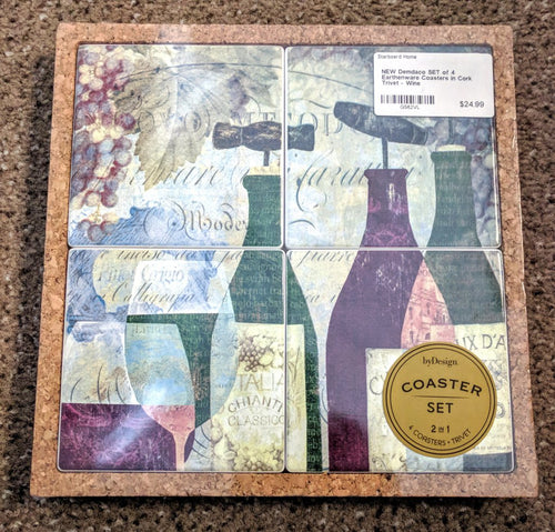 NEW Demdaco SET of 4 Earthenware Coasters in Cork Trivet - Wine