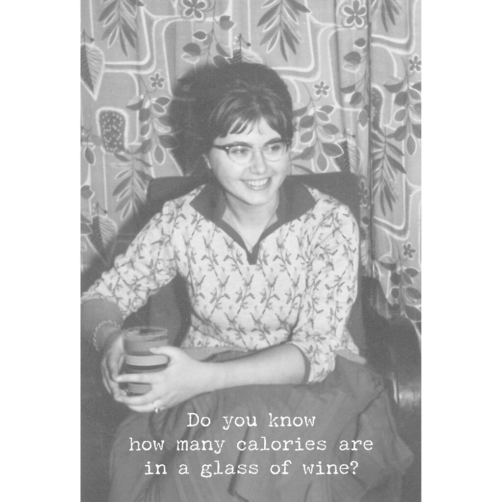A humorous greeting card from our Trash Talk by Annie Collection features a vintage photograph with "Do You Know How Many Calories Are In A Glass Of Wine?" sentiment on the outside, and "Of Course You Don't, That's Why We're Friends." sentiment on the inside. Our Glass Of Wine greeting card is made in the USA.