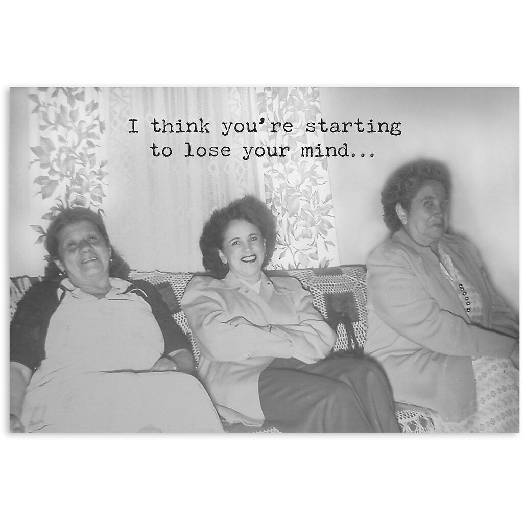 A humorous greeting card from our Trash Talk by Annie Collection features a vintage photograph with "I think you're starting to lose your mind..." sentiment on the front, and "but as long as you keep the part that tells you "I gotta pee," you'll be okay!" sentiment on the inside. Our Lose your Mind greeting card is made in the USA.
