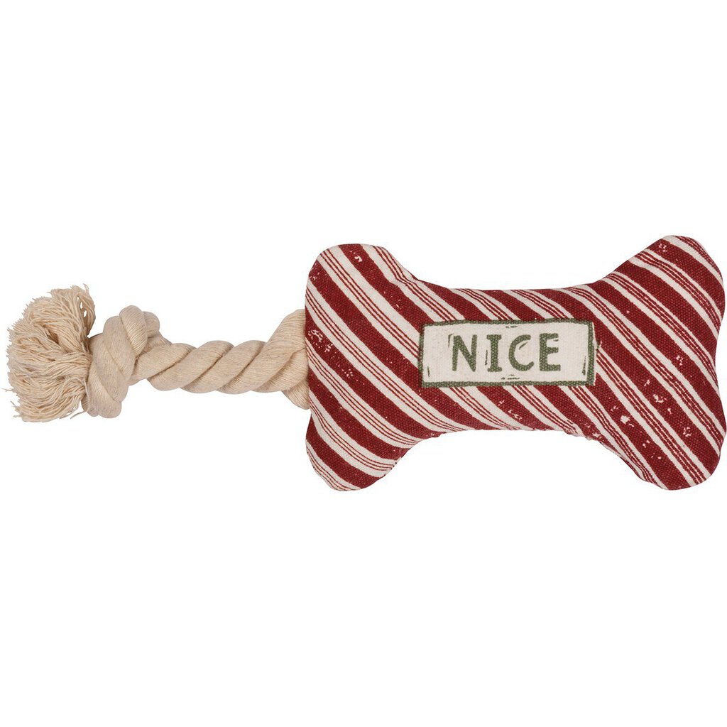 A double-sided cotton dog toy with attached rope element. Features a candy stripe design on both sides with "Nice" sentiment on one side and "Naughty" sentiment on other side. Makes crinkle sound.
