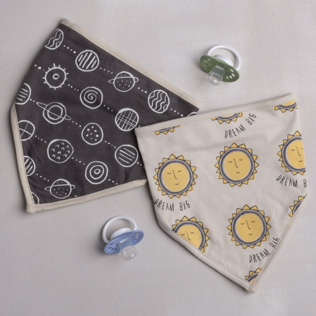 A set of two bandana-style bibs featuring one "Dream Big" sentiment with sun designs bib and coordinating planet print bib. Contain adjustable metal clasp closures. Machine-washable. A part of our exclusive Happy + Bright Collection. Textiles are phthalate and AZO dye free.