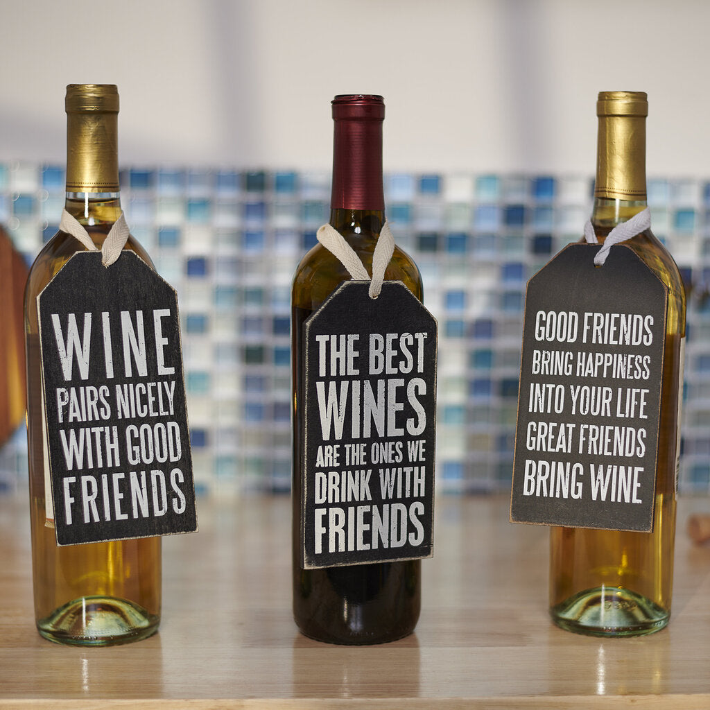 Classic black and white wooden bottle tag featuring distressed "Good Friends Bring Happiness Into Your Life - Great Friends Bring Wine" sentiment with reverse dot designs. Top fabric loop for attaching to a bottle of wine.