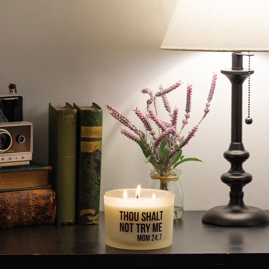 A frosted glass vessel holds this soy-based wax candle with a refreshing Lavender scent. Box sign style art features "Thou Shalt Not Try Me Mom 24:7" sentiment. Candle is 14 oz. and contains three fabric wicks for a total of 30 hours of burn time. Includes a plastic wax cover for protection and a polished look.