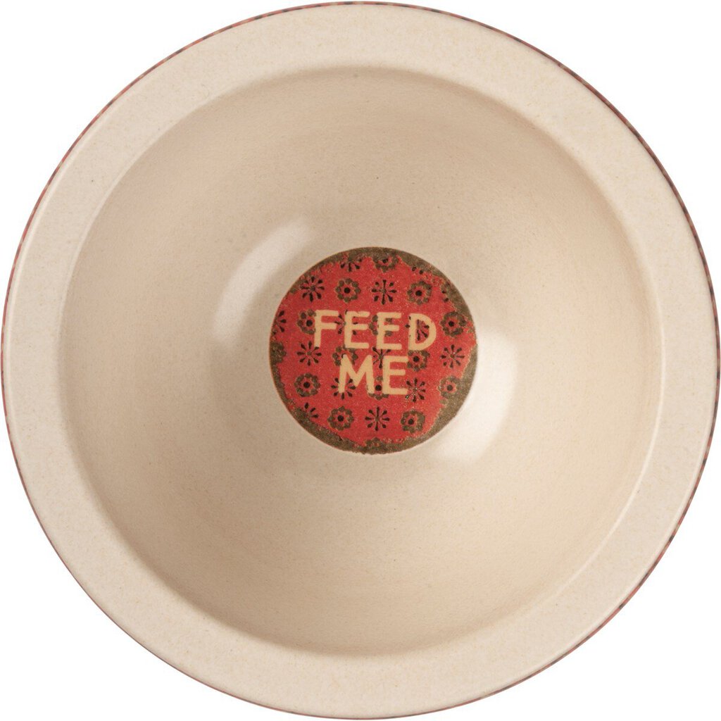 A large bamboo pet bowl featuring a full wrap-around outer tan design, paw print design, and "Eat Sleep Bark Repeat" sentiment. Inner bottom features flower design with "Feed Me" sentiment. Microwave safe. NOT dishwasher safe.