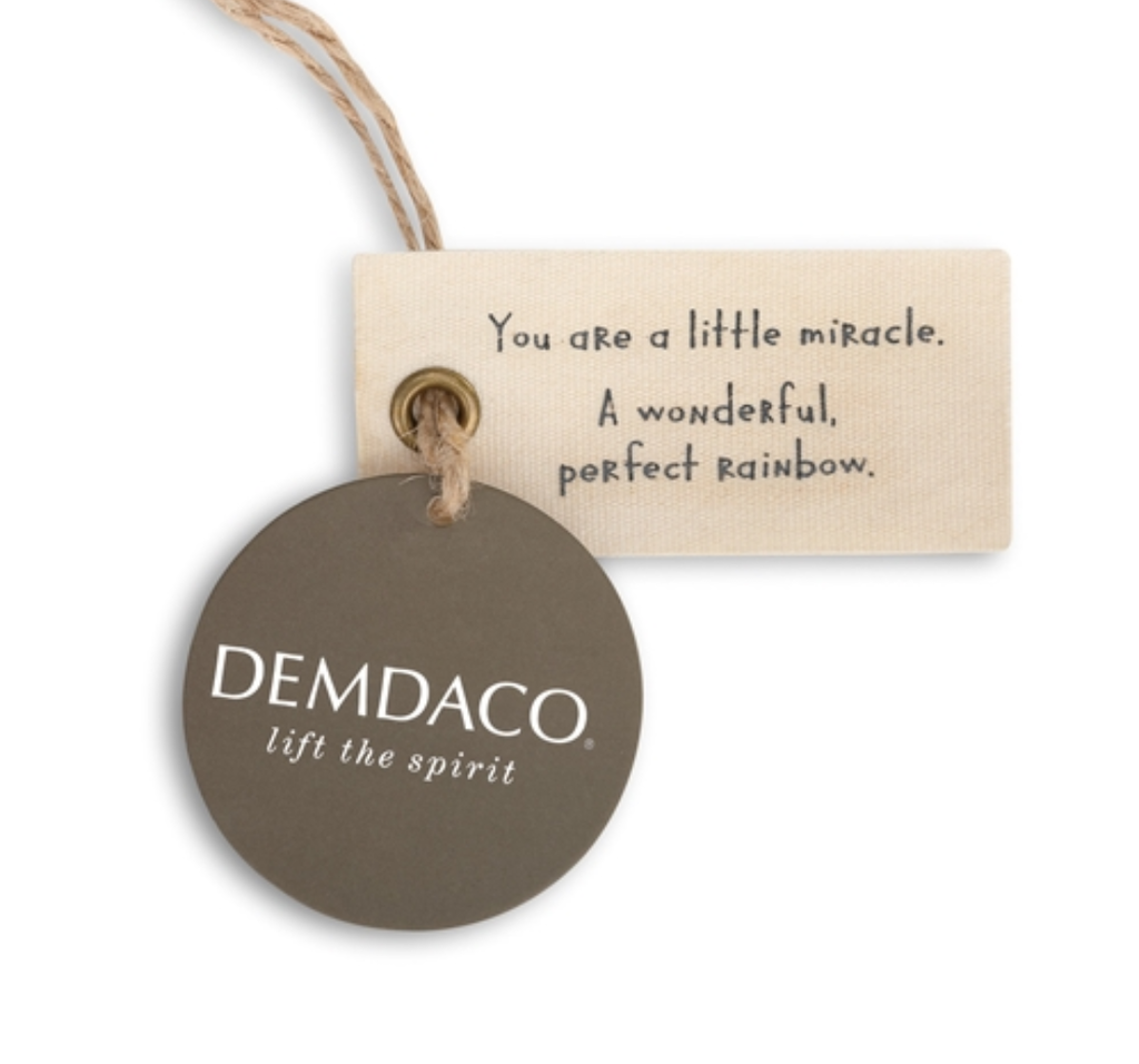 Plush polyester. 5.5"w x 8"d x 13"h. Sentiment: You are a little miracle. A wonderful, perfect rainbow.