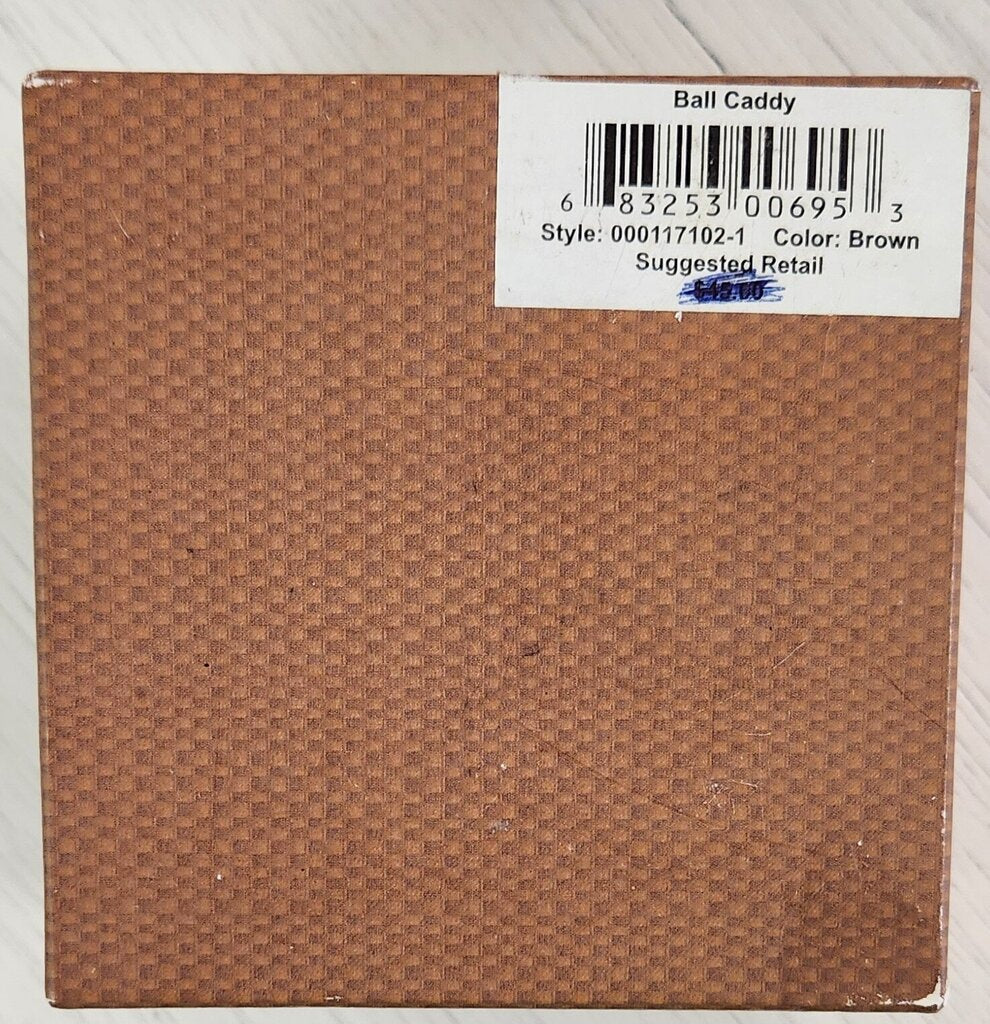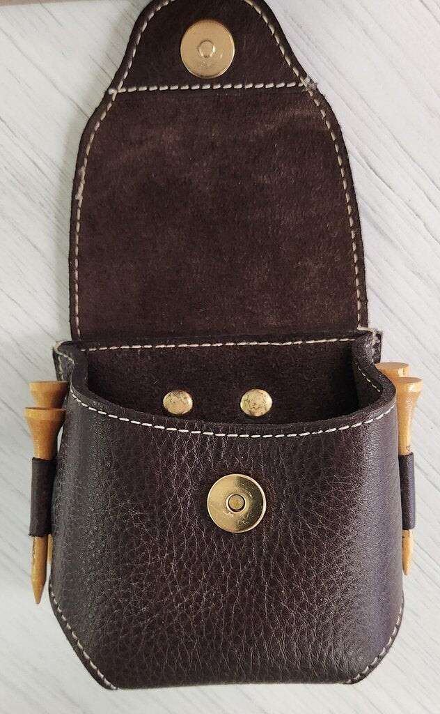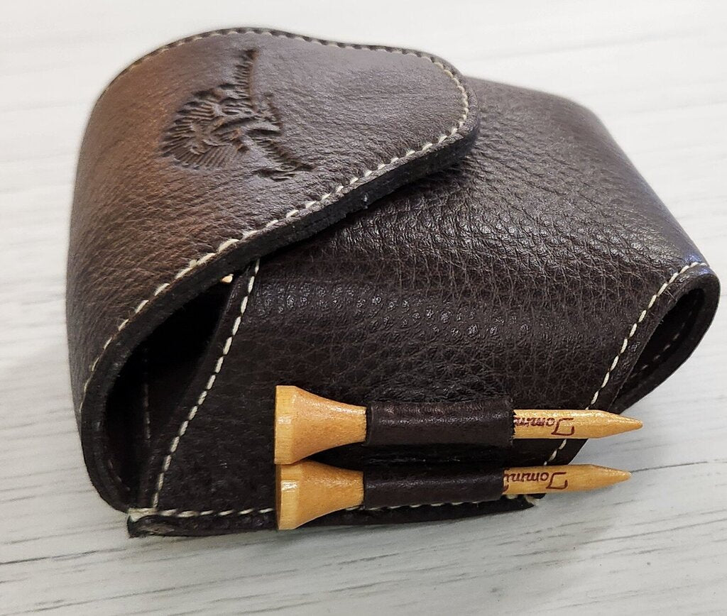 Leather holder embossed with Tommy Bahama logo, and four wood tees with Tommy Bahama logo. Carries 2-4 golf balls, not included. Snap close in front. Snap on loop for belt. Original box with minor wear; see photo.