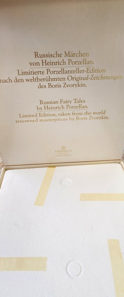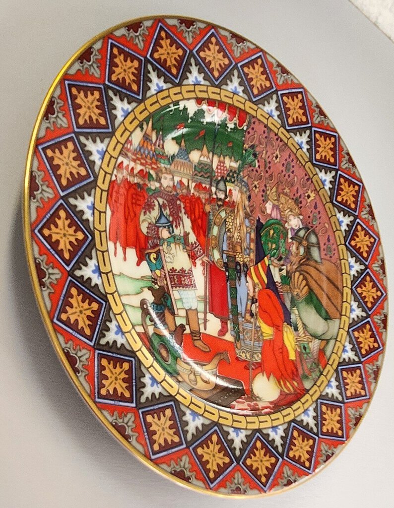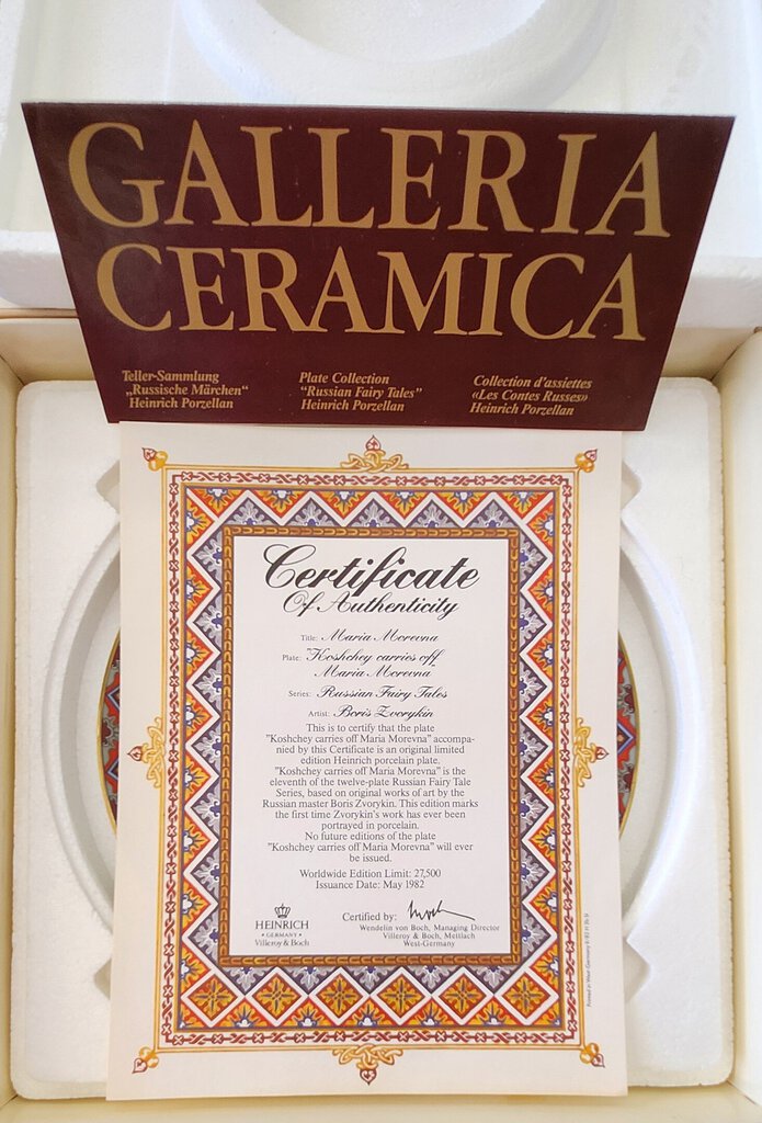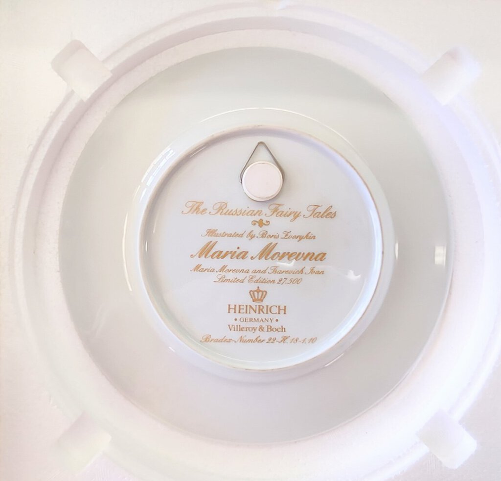 Vintage collector plate from Villeroy & Boch's The Russian Fairy Tales collection features the story of Maria Morevna and Tsarevich Ivan. 8.5" diameter. Porcelain. Limited edition. Certificate of Authenticity and original box. Minor wear to box.