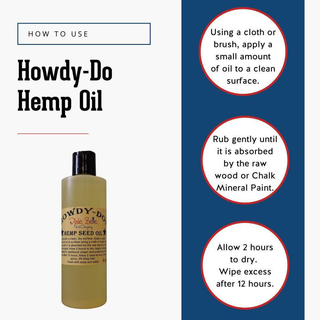 Hemp Oil dries to a matte finish and will not produce a gloss or even much sheen. This naturally thin viscosity oil will penetrate porous surfaces well. Use on bare wood, over DBP chalk mineral paint, cutting boards, carved utensils, and to revive old wood finishes. A little goes a long way and will harden with DBP within 30 days to create a beautiful, durable, water resistant finish.