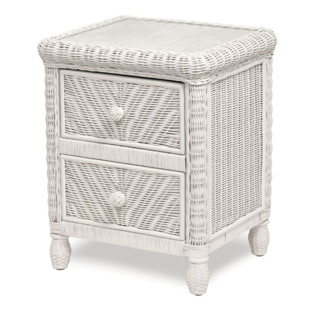 This nightstand is part of a wicker collection that offers a wide variety of pieces to accommodate many needs. It features hand woven knobs, unique weaving pattern and inset glass top. Drawers are constructed of solid wood and use metal side glides with nylon rollers and formed stops. Frame is made of kiln dried solid wood products. Dimensions: 21.5" W x 18" D x 25.5" H
