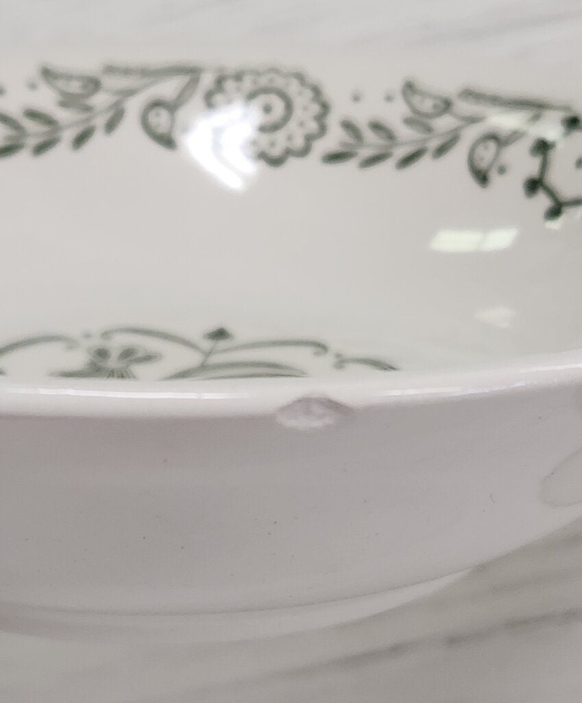 Green design on off-white background. Two each: 7.5" diameter, 1.5"H; 6.25" diameter, 1.75"H. One bowl has an appox. 1/8 inch chip on edge; see photos.
