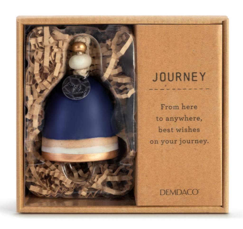 By Demdaco. From the Inspired Everyday Collection. A melodic gift that showcases thoughtful craftsmanship. Bell: 2"w x 2"h; Hanger: 4"h. Stoneware, metal, wood, iron. Sentiment: Journey